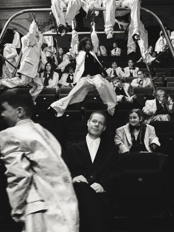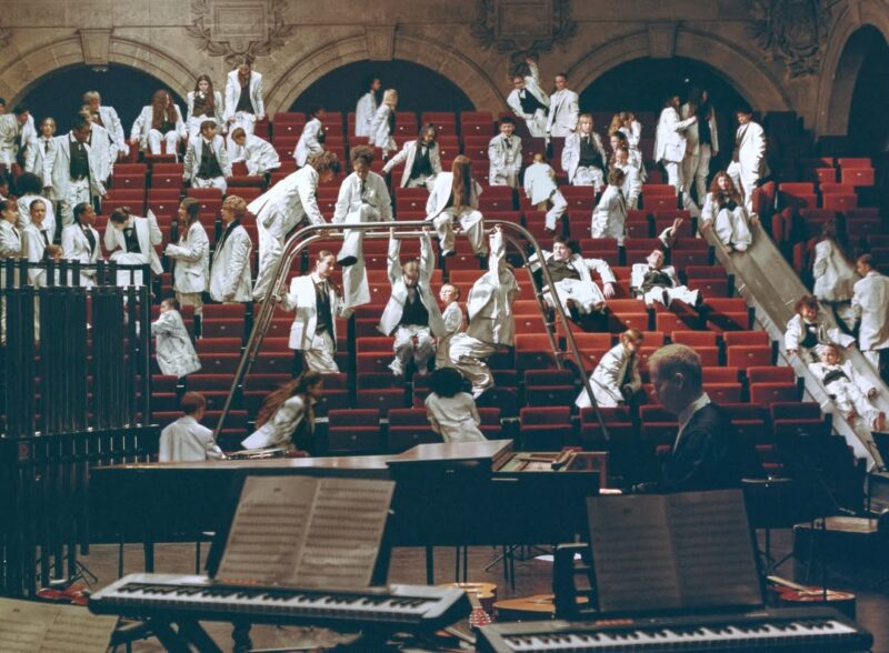Réalisé par Thibault Grevet, le film capte ce temps long. Les répétitions, l’apprentissage, les moments où la tension retombe, ceux où la musique reprend. Les enfants traversent la scène du Théâtre de la Villette, leurs corps débordant de costumes trop grands, peints en blanc selon le traitement Bianchetto de la maison. Un blanc qui ressemble moins à un uniforme qu’à quelque chose qu’on aurait porté toute une journée et sali par joie.