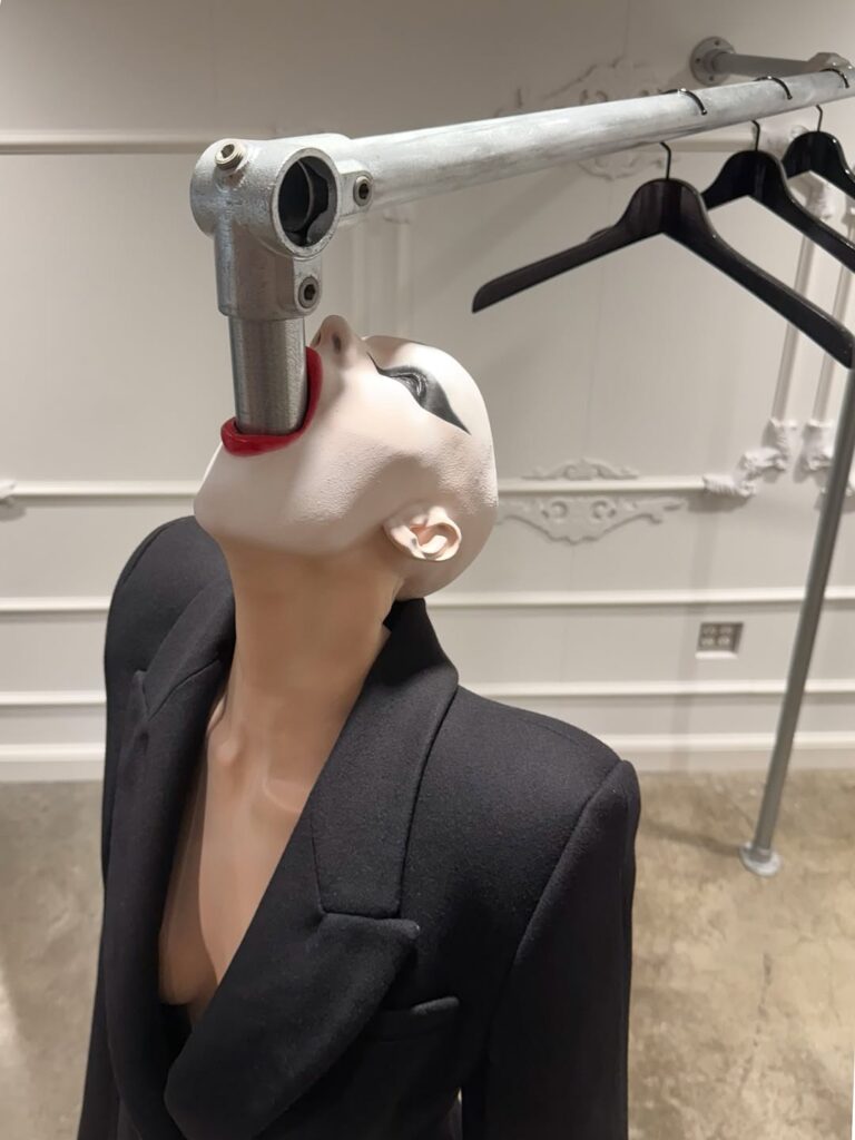 Pour célébrer l’arrivée de la première collection de son label chez Dover Street Market New York, le duo d’artistes Fecal Matter formé par Hannah Rose Dalton et Steven Raj Bhaskaran a fait appel à la muse et icône trans Amanda Lepore, afin de réaliser une performance incarnant sa vision radicale de la beauté. Motivés par cette même recherche de beauté extrême, qui les a conduit à quitter leur ville d’origine pour rejoindre New York il y a dix ans, le duo a imaginé un portant composé de l’alter ego plus vrai que nature d’Hannah Rose Dalton, empalé par la bouche sur les cylindres en métal formant la structure.