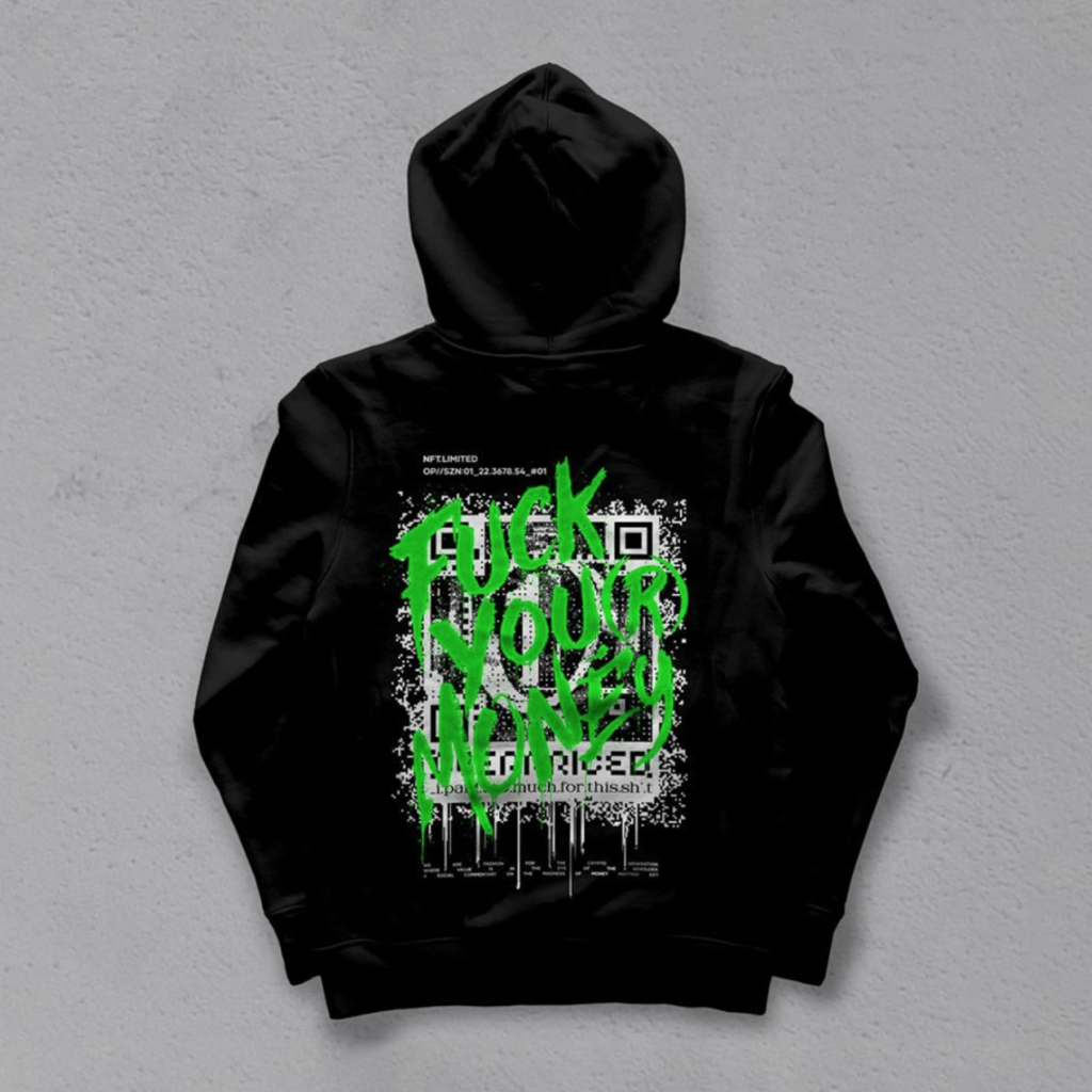 Imaginé par le label Overpriced, un sweat à capuche virtuel estampillé du message « fuck your money » a été vendu près de 22 000 euros sous la forme d’un NFT