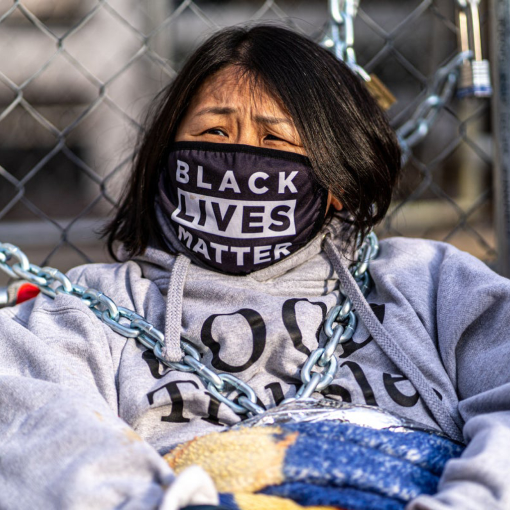 Plusieurs personnes se sont enchaînées aux grilles du tribunal de Minneapolis, où se tient le procès de Derek Chauvin, pour réclamer une réforme de la police et justice pour George Floyd