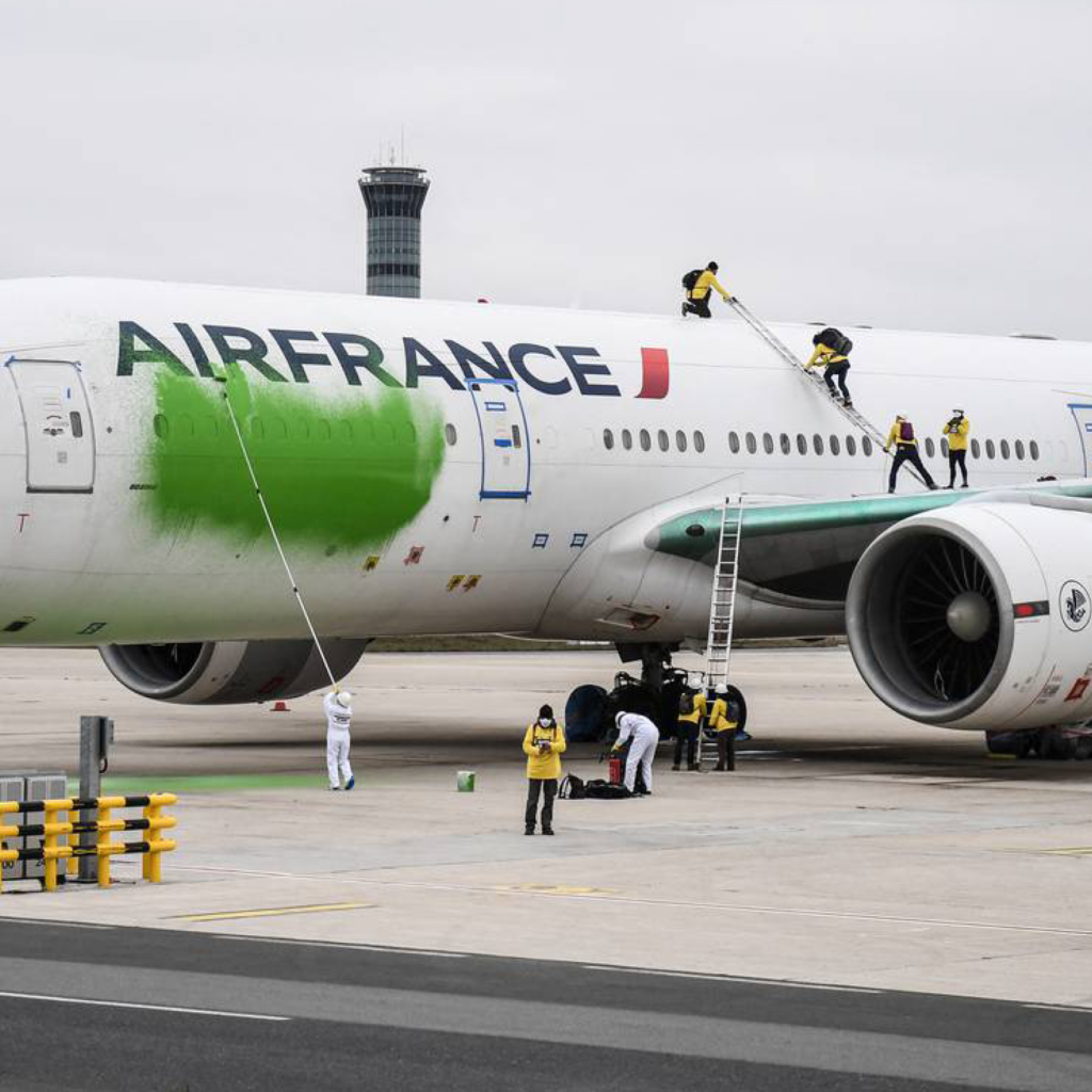 Des activistes de l’ONG Greenpeace ont repeint un avion en vert sur le tarmac de l’aéroport de Roissy, pour dénoncer le « manque d’ambition du projet de loi Climat »