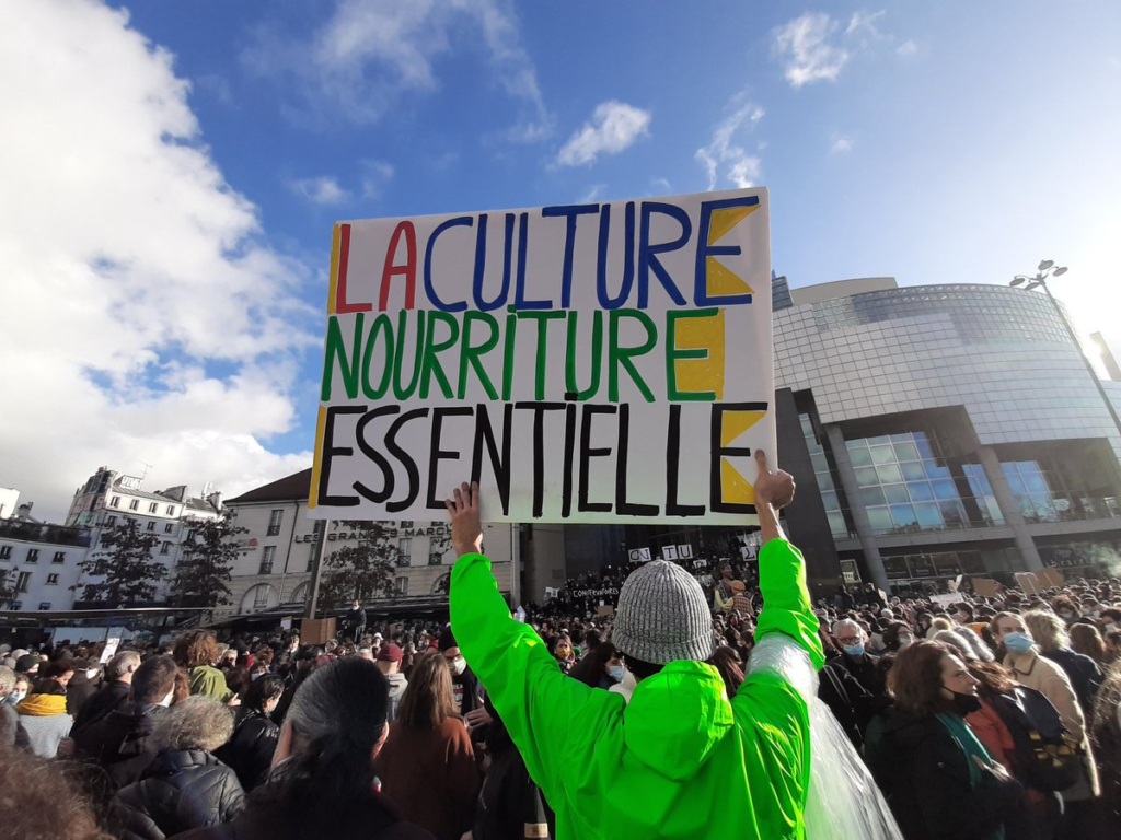 Répondant à l’appel de la CGT, les professionnel·le·s du spectacle ont manifesté ce mardi midi place de la Bastille pour dénoncer le report de la réouverture des salles de spectacles, théâtres et cinéma