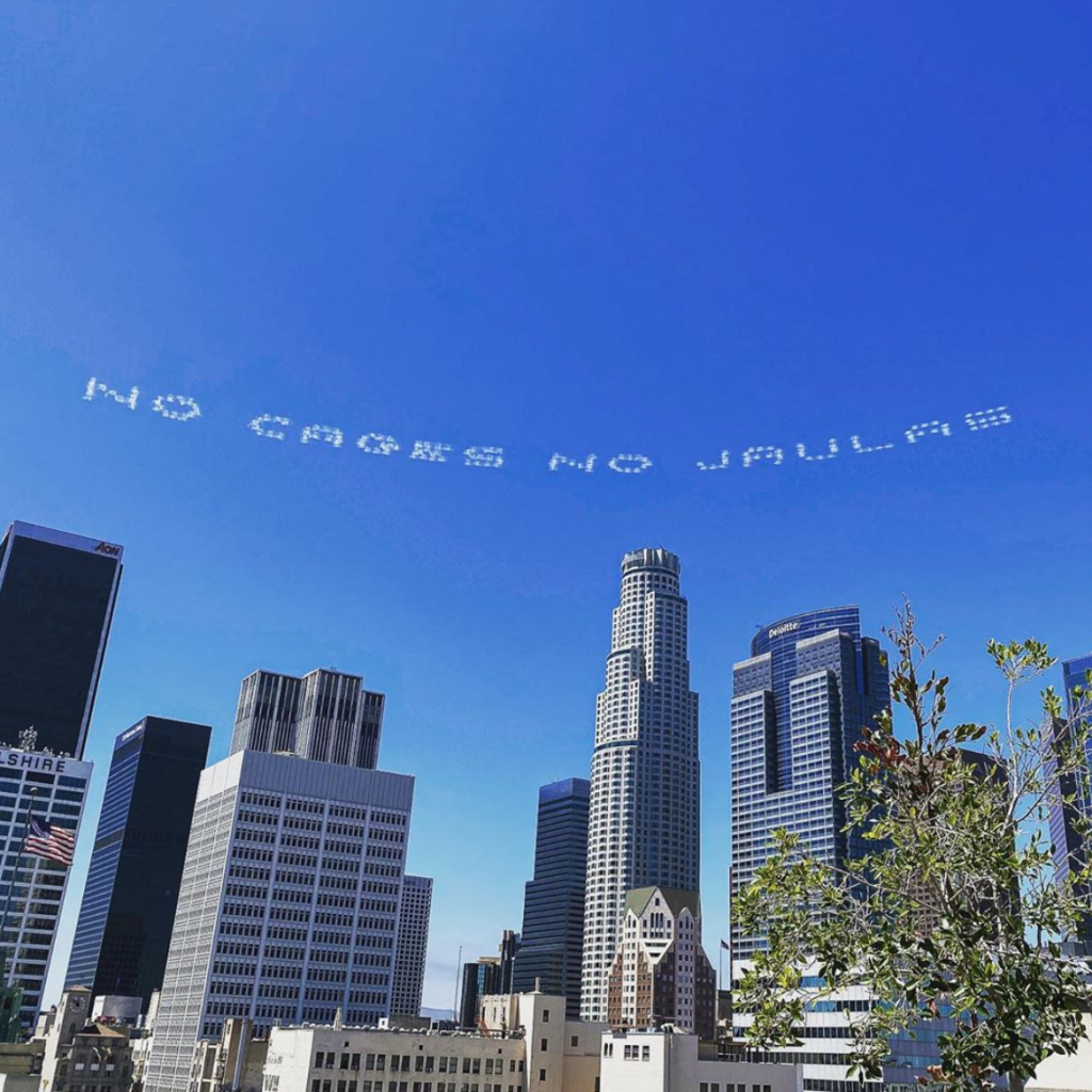 Pour dénoncer la détention de migrants dans des camps, le collectif d’artistes In Plain Sight a diffusé des slogans en vapeur d’eau dans le ciel américain