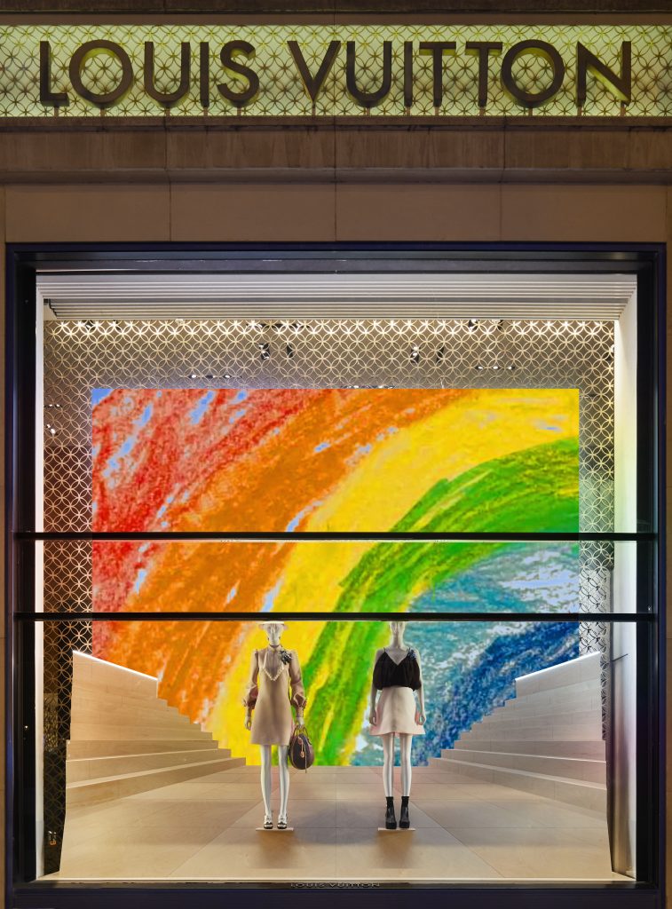 Pour habiller ses vitrines, la maison Louis Vuitton a demandé à ses collaborateurs de dessiner des arcs-en-ciel, symboles d’espoir, dans le cadre de son projet « The Rainbow Project »