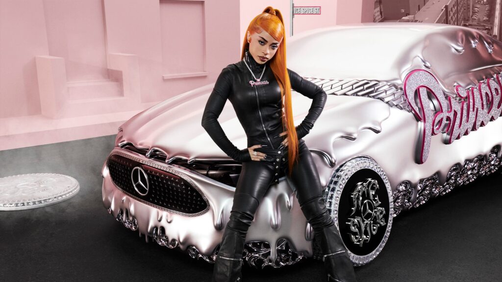 Ice Spice a été choisie pour donner le coup d’envoi à la « Class of Creators », une initiative de Mercedes-Benz visant à étendre son spectre de collaborateur·rice·s. L’artiste s’est réapproprié le modèle CLA, le parant de chrome à l’effet fondu et d’un bijou géant en chaîne diamantée « Princess of Rap ».