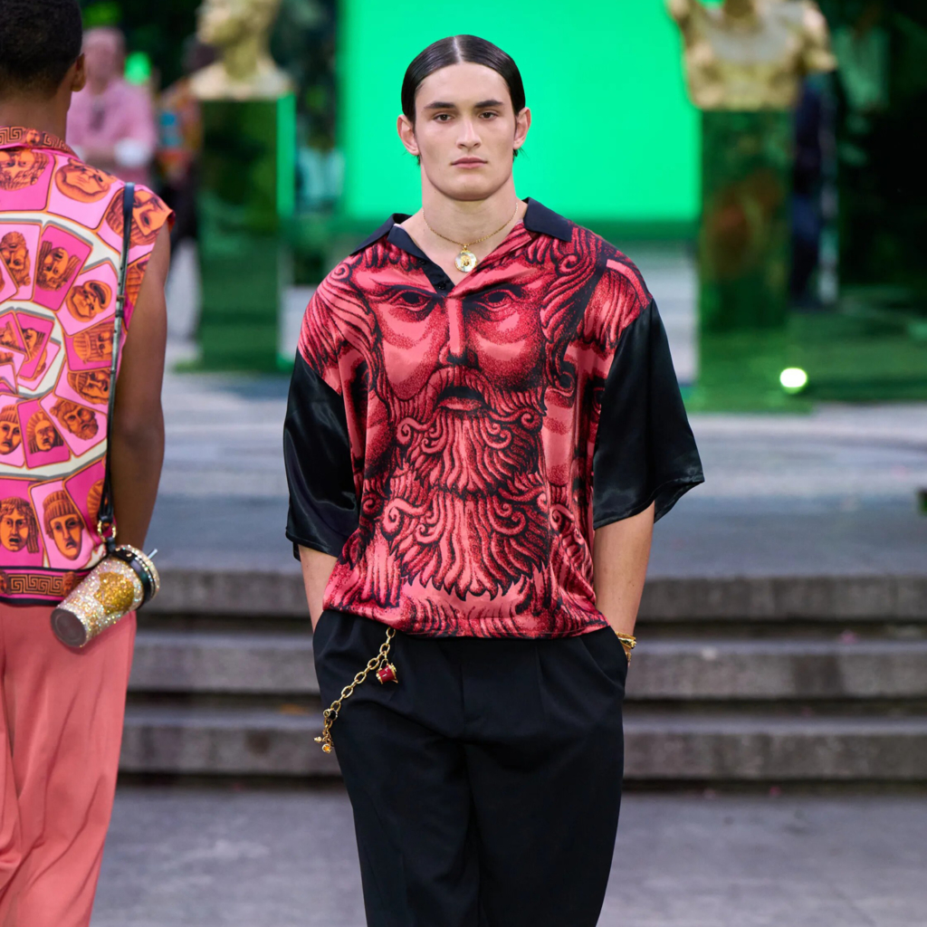 Donatella Versace a enrôlé les fils des mannequins Helena Christensen, Meghan Douglas ou encore Carla Bruni pour son défilé homme printemps-été 2023, dévoilé à Milan le 18 juin