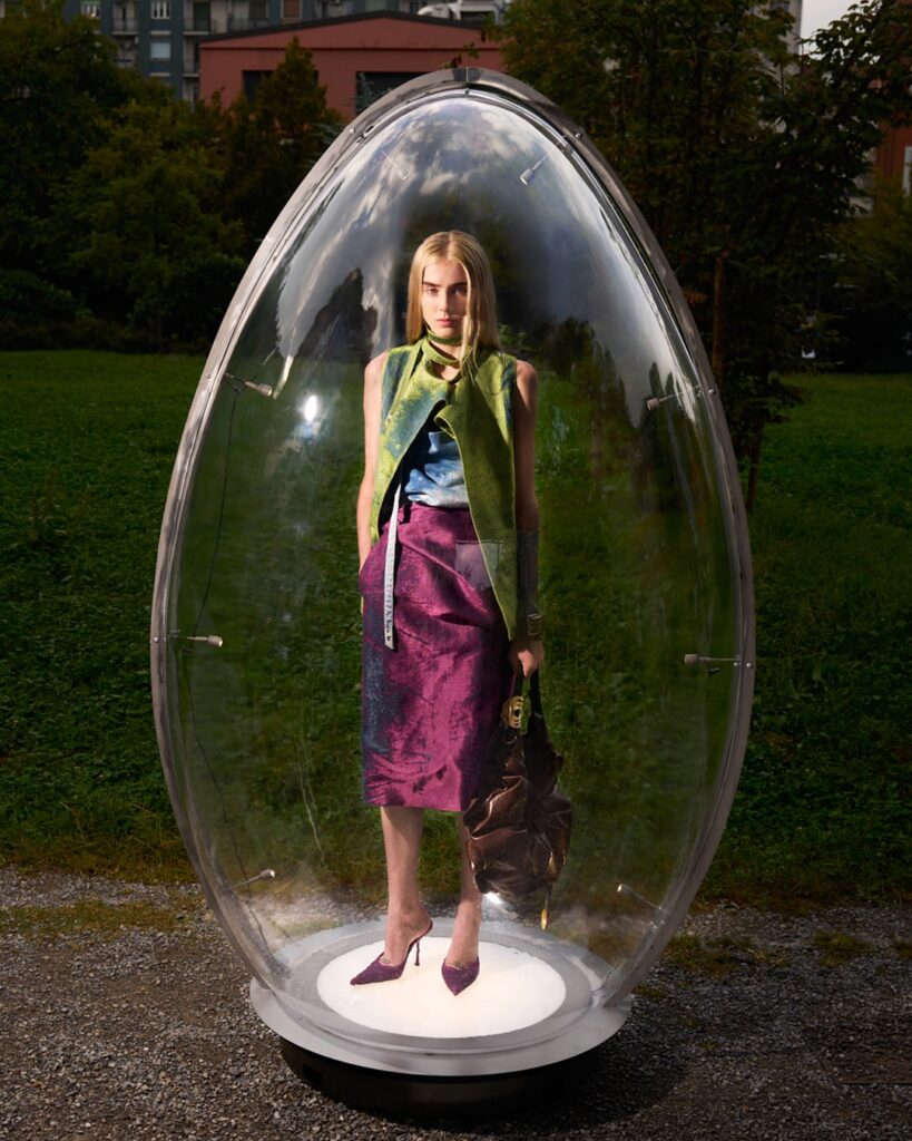 Ce mardi 23 septembre, premier jour de la Fashion Week de Milan, Diesel organise une chasse aux œufs à travers les rues de la ville pour présenter les nouvelles silhouettes imaginées par Glenn Martens. Mu par une volonté d’être le plus démocratique possible, le directeur artistique a ainsi disséminé les 55 looks de sa collection, enfermés dans des capsules transparentes de forme ovoïde, dans les rues de la capitale lombarde.