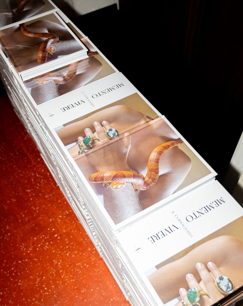 Publié par Marsilio Arte, « Memento Vivere A. Codognato » célèbre l’univers du joaillier vénitien Attilio Codognato. L’ouvrage rassemble plus de 150 photographies saisissantes signées Juergen Teller, Ruven Afanador, Mario Sorrenti et Sante D’Orazio. À travers ces images, le livre explore l’univers énigmatique de Codognato où serpents, camées et crânes transcendent l’ornement pour devenir de véritables talismans, incarnant un dialogue entre la vie et la mort.