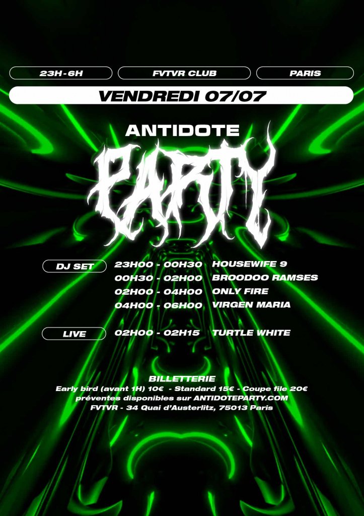 Antidote a le plaisir d’annoncer sa nouvelle soirée le 07 Juillet 2023 au club FVTVR avec DJ sets et performances artistiques au programme.