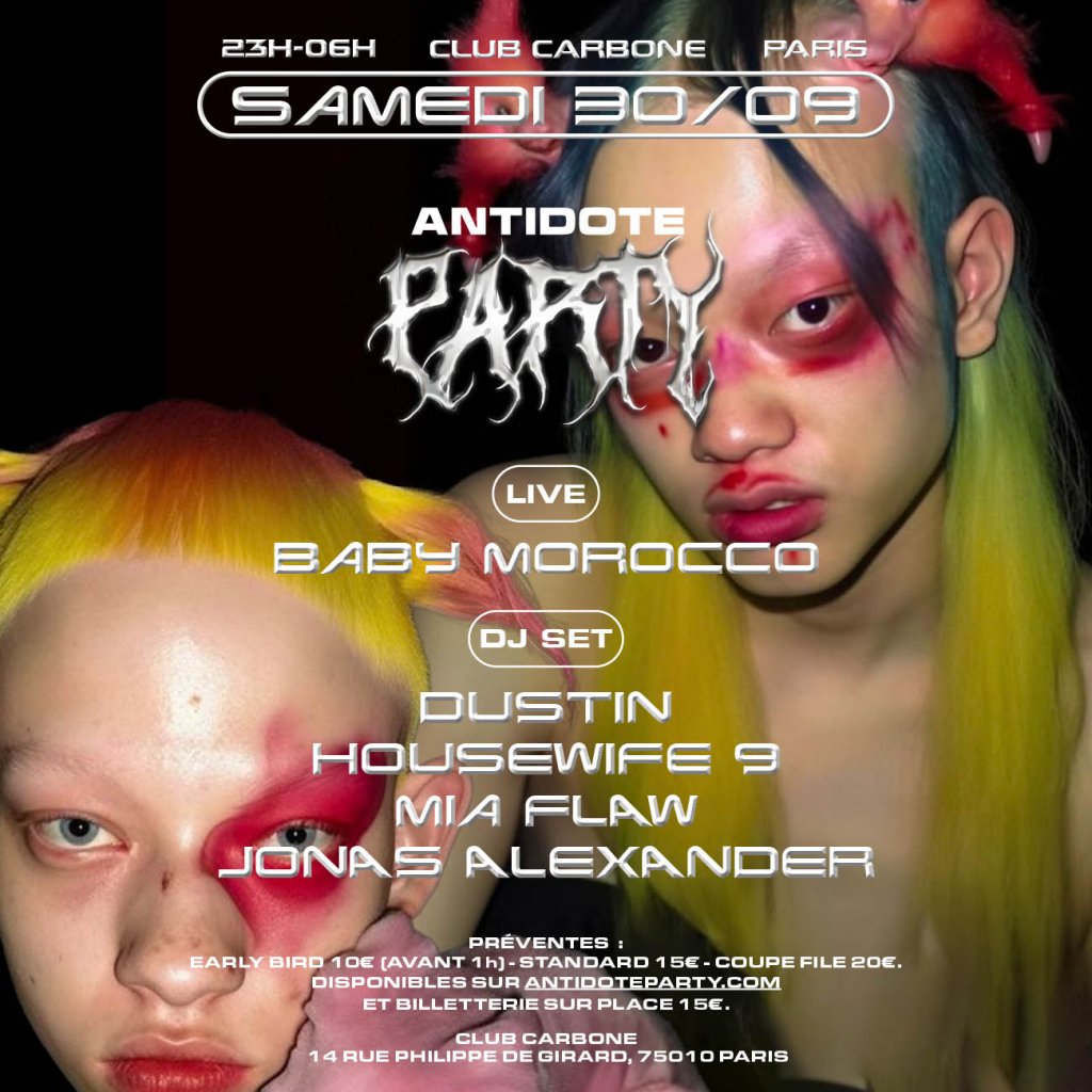 Antidote a le plaisir d’annoncer une nouvelle ANTIDOTE FASHION WEEK PARTY, le 30 SEPTEMBRE 2023, au club CARBONE (14 Rue Philippe de Girard, dans le 10ème arrondissement de Paris). Au programme de cette soirée, qui se déroulera de 23h à 6h : un live de Baby Morocco et des DJ sets de Dustin, Housewife 9, Mia Flaw et Jonas Alexander.