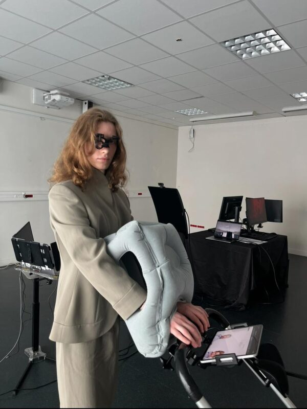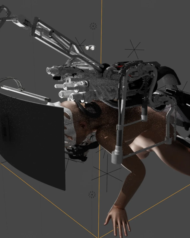 Dans son œuvre, la mère, protectrice, exigeante, hyper-connectée, à la fois femme, machine et mythe, est omni-présente. C’est cette dualité, entre douceur et contrôle, qu’Hélio réactive dans « iMom, * (ai)Baby ». Le corps y devient machine, la tendresse, un système. Le spectateur assiste à une boucle émotionnelle entre amour et dépendance. Formé au design d’espace, Hélio manipule la notion de confort: ce qu’on croit apaisant devient contraignant, ce qui rassure finit par enfermer.
