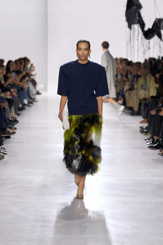 Après avoir passé une quinzaine d’année chez Gucci et dirigé les collections de Bally pendant deux ans, Simone Bellotti a pris la succession du duo Luke et Lucie Meier, révéré pour ses collections à l’élégance épurée, composées de pièces minimalistes, arty et conceptuelles. Pour son premier défilé, le designer a renoué avec un minimalisme plus radical, proposant des pièces monochromes jouant sur les textures, le layering, les détails anguleux et les ouvertures tranchantes, entaillant le dos d’une chemise ou l’avant d’une jupe.
