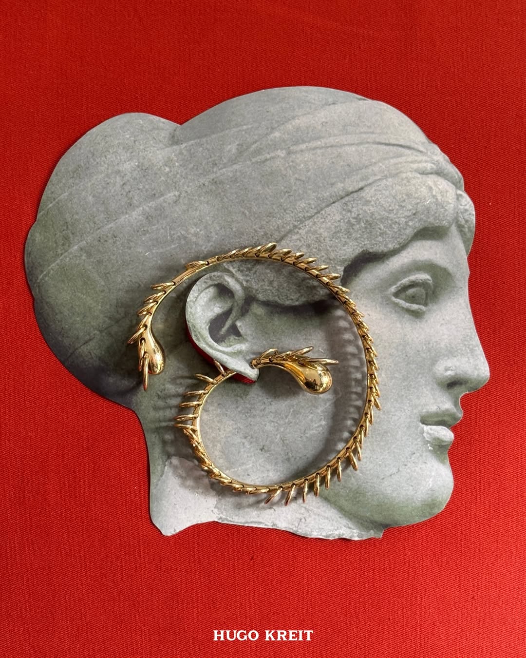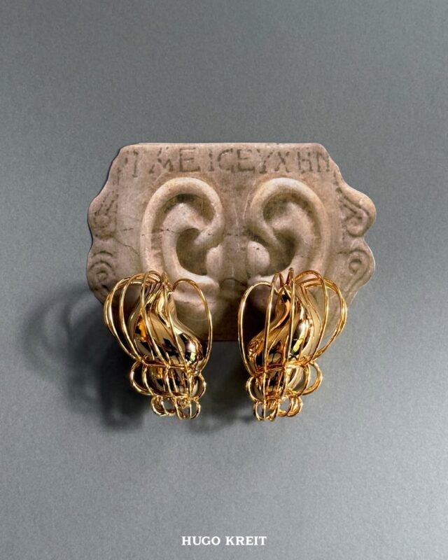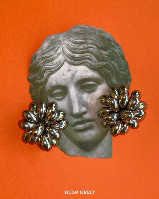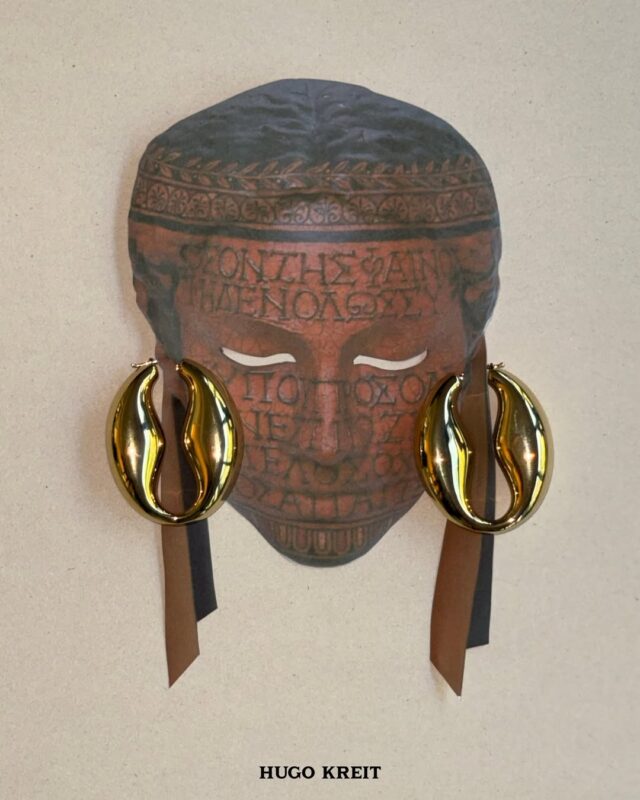 À travers une série de vidéos et de photos récemment publiées sur son compte Instagram, Hugo Kreit détourne les codes du bijou contemporain pour les lier au passé, en disposant ses ear cuffs et autres boucles d’oreilles sur des visages antiques issus de différentes cultures. Du crâne allongé d’une statue de princesse égyptienne à la tête d’une amazone conservée aux musées du Capitole à Rome, en passant par un masque de théâtre nô de l’époque Edo, la série de visuels met également en lumière l’évolution des canons de beauté. Une manière de démontrer que si la notion de beauté n’a cessé d’évoluer selon une zone géographique et une époque données, le désir de s’embellir a, quant à lui, perduré. L’acte universel d’orner son propre corps à l’aide d’une parure s’impose ainsi comme un réflexe profondément humain.