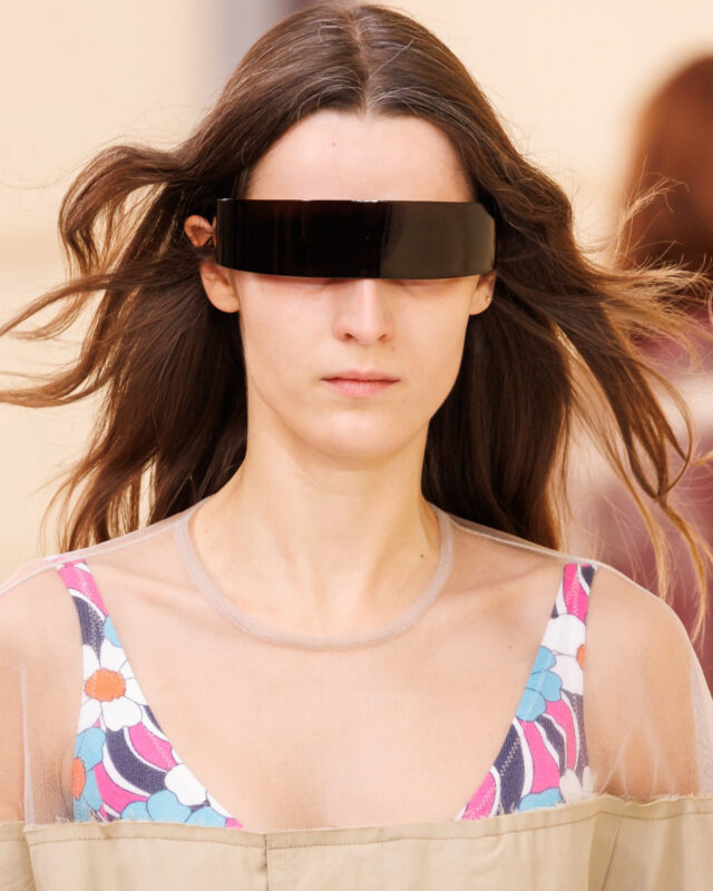 Présenté jeudi 25 septembre lors de la Fashion Week de Milan, la collection MM6 Maison Margiela printemps-été 2026 demeure fidèle au racines du label : celle d’une mode avant-gardiste et conceptuelle mais portable, qui a fait de l’anonymat du collectif de créatif·ve·s derrière chaque collection sa signature. À l’heure où même Maison Margiela, la grande sœur de la ligne MM6 fondée en 1997, cède aux sirènes de la starification, en s’incarnant finalement à travers le visage de Miley Cyrus dans une campagne shootée par Paolo Roversi, le label MM6 continue de cultiver le mystère et d’y croire dur comme fer. Ici, l’accent est mis sur le vêtements, le geste créatif. Les mannequins défilent, sans exception, avec des lunettes futuristes opaques masquant leur regard. Et pour le final, pas de salut de la part d’un·e designer connu·e et reconnu·e. De quoi contraster, non sans ironie, avec de nombreuses pièces de la collection, qui jouent sur la transparence pour dévoiler ce qui se cache derrière, mais également avec le front row, où l’on a pu croiser Ice Spice, Saweetie ou encore Sevdaliza. La mode n’étant pas à un paradoxe prêt.