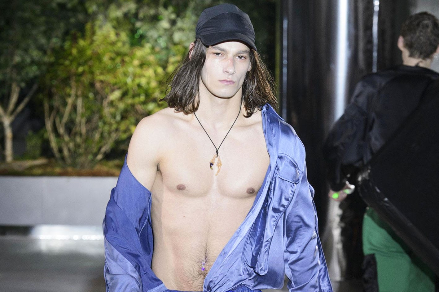 [/vc_column_text][vc_empty_space height= »20px »][vc_single_image image= »26606″ img_size= »large » alignment= »center »][vc_column_text el_class= »legende »]Topman automne-hiver 2017, Versus Versace automne-hiver 2017, Liam Hodges automne-hiver 2017, Marc Jacobs printemps-été 2017 et MSGM automne-hiver 2017[/vc_column_text][vc_empty_space height= »20px »][vc_column_text]Les ensembles de l’automne-hiver 2017 sont colorés, pétants, tacky. Quelque part entre les ravers des nineties et les fluo kids des années 2000, plusieurs griffes ont fait, cette saison, le choix du bariolé pour coller au plus près de leurs aspirations. Chez Topman, les vestes patchwork multicolores riment avec les tops à imprimés ou autre K-Way rose fuchsia. « Les cheveux sont sales, gras, la peau aussi. C’est le look de ceux qui travaillent à l’extérieur toute la journée et qui clubbent toute la nuit », indique la marque.[/vc_column_text][vc_empty_space height= »40px »][vc_single_image image= »26607″ img_size= »large » alignment= »center »][vc_column_text el_class= »legende »]Dior Homme, Cottweiler, Alexander Wang et Christopher Shannon automne-hiver 2017[/vc_column_text][vc_empty_space height= »20px »][vc_column_text]Dans un tout autre style où transpiration et survêtement sont de rigueur, le gabber des années 1990, adepte de techno hardcore et de crâne à demi rasé, revit aujourd’hui ses heures de gloire. Chez Cottweiler, les cheveux sont dégoulinants, les vestes et joggings bleu pétant ou vert forêt. Chez Dior Homme, on préfère mixer un vestiaire classique sur le haut du corps avec des pièces street sur le bas. Kris Van Assche mélange gabbers, candy boys et ravers, et détourne même le travail de l’artiste Dan Witz – qui documente et peint depuis des années les mosh pits, ces danses pogo très viriles – en imprimé. En point d’orgue, le slogan « THEY SHOULD JUST LET US RAVE » apparait sur des pulls en maille sous un portrait de Christian Dior.[/vc_column_text][vc_empty_space height= »40px »][vc_single_image image= »26577″ img_size= »large » alignment= »center »][vc_column_text el_class= »legende »]MISBHV automne-hiver 2017[/vc_column_text][vc_empty_space height= »40px »][vc_column_text]À New York, le label polonais MISBHV se la jouait post-soviet au pays de l’Oncle Sam avec une collection intitulée « 6 years in a rave ». Lunettes kitsch, pantalon et jupe en vinyle, doudoune et survêtement rouge soviétique font office d’uniforme pour les ravers du bloc Est. Quelques jours plus tôt, Alexander Wang transformait à son tour son podium new-yorkais en fête ténébreuse, les silhouettes défilent dans des tons sombres fidèles au créateur et portent fièrement des collants signés de l’inscription « NO AFTER PARTY » avant que Wang lui-même ne surgisse des coulisses vêtu d’un sweat au même slogan.[/vc_column_text][vc_empty_space height= »20px »][vc_column_text]