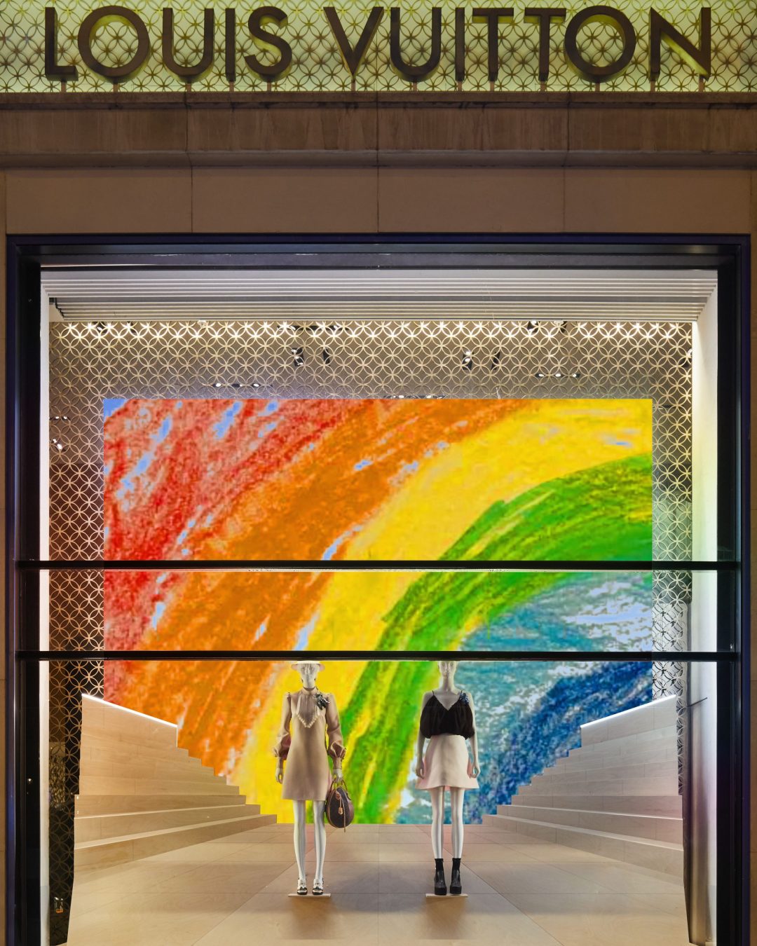 Pour habiller ses vitrines, la maison Louis Vuitton a demandé à ses collaborateurs de dessiner des arcs-en-ciel, symboles d’espoir, dans le cadre de son projet « The Rainbow Project »