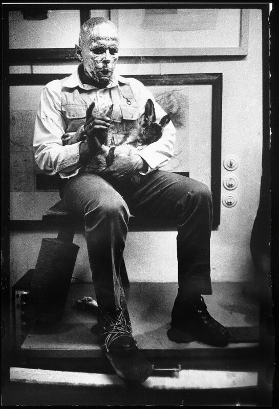 Beuys, figure majeure de l’art conceptuel allemand, est resté célèbre pour ses actions radicales : vivre une semaine, enfermé avec un coyote dans une galerie, brancher une ampoule sur un citron, ou expliquer des images à un lièvre mort, en 1965. Sur les clichés de cette dernière performance, l’artiste porte une paire de bottes massives, liées d’un enchevêtrement de lanières — étrangement proches des créations de Rick Owens. Chez l’un comme chez l’autre, la botte n’est pas qu’un accessoire : c’est un instrument rituel, une armure qui donne corps à la pensée. Owens ne copie pas Beuys, il le prolonge, et sans le savoir, il en est l’héritier.