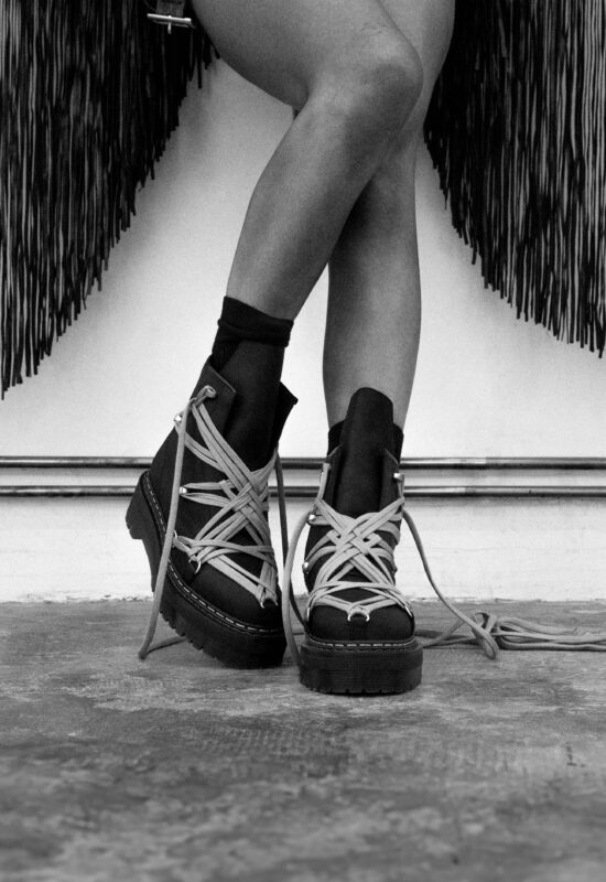 C’est dans ce moment de révélation que naît la nouvelle collaboration entre Rick Owens et Dr. Martens. Une rencontre entre deux icônes : la chaussure ouvrière et l’architecte du sublime gothique. Owens reprend ainsi le modèle « 1460 Bex » et y appose son rituel : les lacets deviennent pentagrammes, la rigueur devient mysticisme. Ce n’est plus une boot, mais un symbole — celui de la fusion entre l’énergie prolétaire et la dévotion artistique.