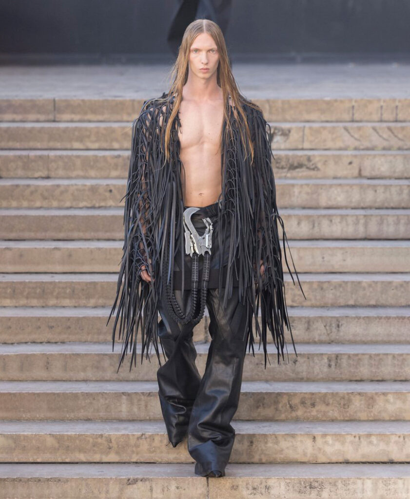 Au Palais de Tokyo, Rick Owens signe un nouveau show spectaculaire, où les silhouettes plongent littéralement dans l’eau avant de ressurgir trempées. Baptême gothique, introspection sur la gloire et la mort, hommage à son propre parcours… Dans cette collection faite de nylon, denim, soie et cuir, Rick Owens explore son ADN : un « elegant sleaze » radical, où shorts découpés, vestes effilochées et capes de cuir frangées composent un vestiaire théâtral et brutal, sublimé par la mise en scène aquatique.