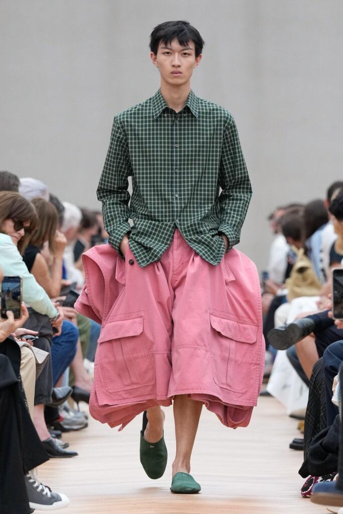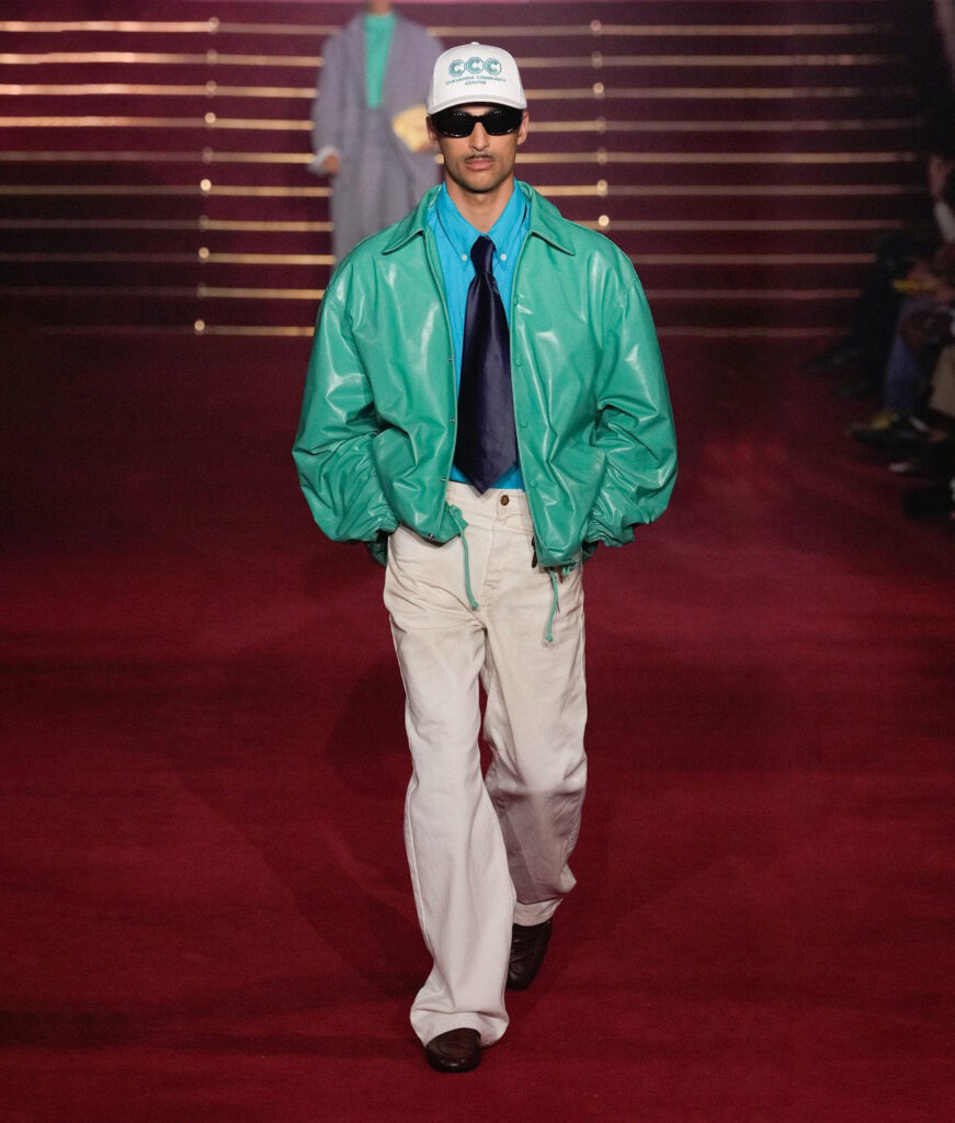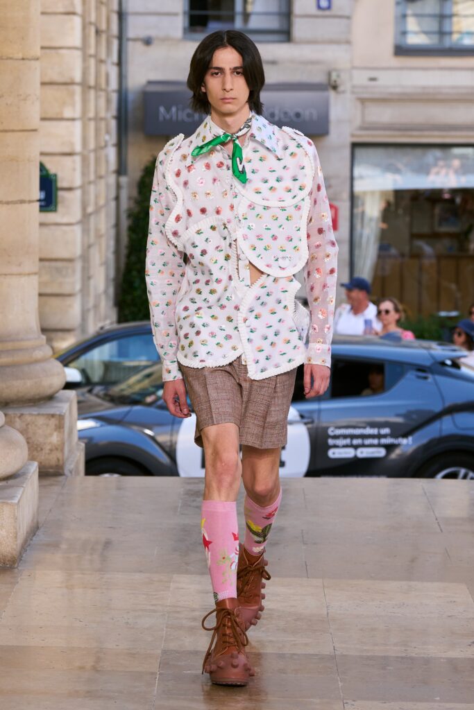 Pour sa collection inaugurale chez Dior, Jonathan Anderson orchestre un défilé entre dandy casual et normcore assumé. Vestes d’officier, pantalons en denim ou rentré dans les chaussettes, cravates légèrement relâchées, lacets défaits : la silhouette Dior Homme se joue des contrastes avec poésie. Les basques du mythique tailleur Bar donnent naissance à de nouveaux trenchs sculpturaux aux volumes de tissu plissées sur les hanches, tandis que des trèfles à quatre feuilles et des fleurs ponctuent certaines pièces.