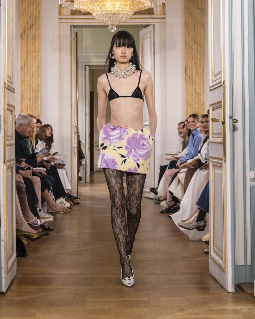 Mini jupe, mini bra, maxi aura. Présentée à Paris ce dimanche 6 juillet, la collection printemps-été 2026 de Patou, intitulée « JOY », célèbre une élégance affûtée et une sensualité urbaine. Guillaume Henry, le directeur artistique de la maison, compose cette saison un vestiaire fait de contrastes : taffetas froissé, dentelles légères, tailleurs structurés et éclats argentés, sur les cols rigides de vestes portés avec des mini-robes.