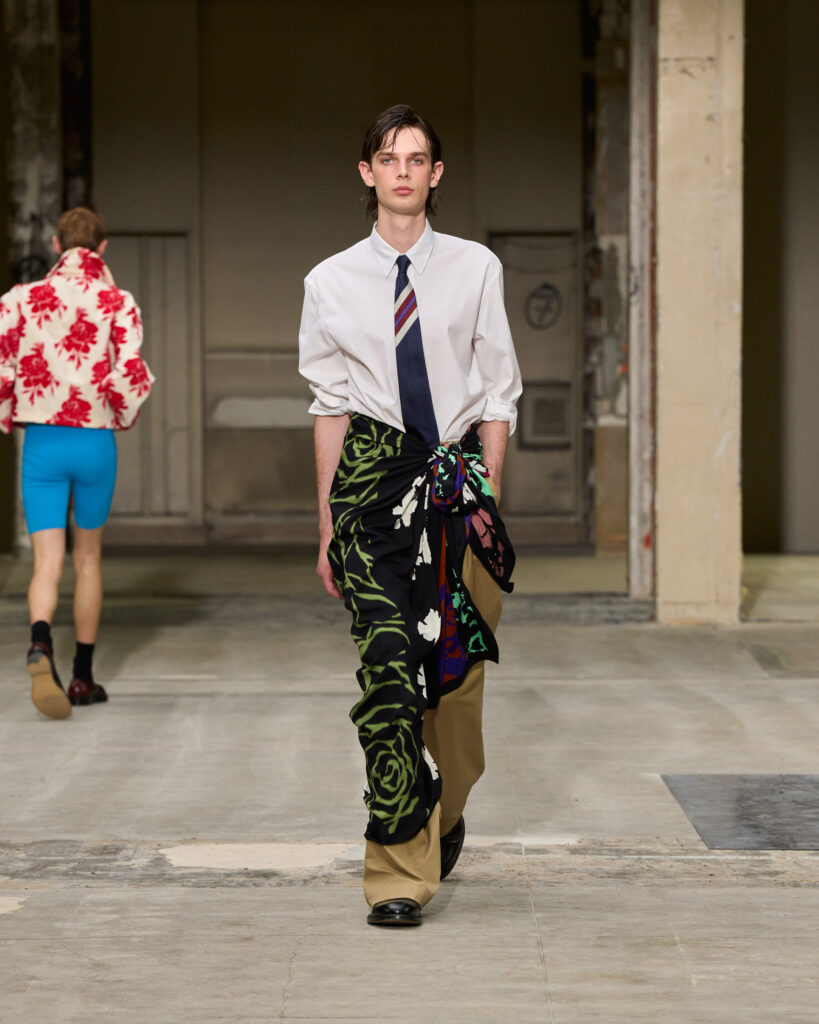 Entre classicisme et spontanéité, le premier défilé homme de Julian Klausner pour Dries Van Noten a démontré que le successeur du créateur anversois était la meilleure personne pour reprendre le flambeau. Fidèle aux codes de la maison, le designer a imaginé pour le printemps-été 2026 une garde-robe reprenant les codes du tailoring mais les faisant flirter avec l’esprit d’un moment suspendu en bord de mer, à l’aube.