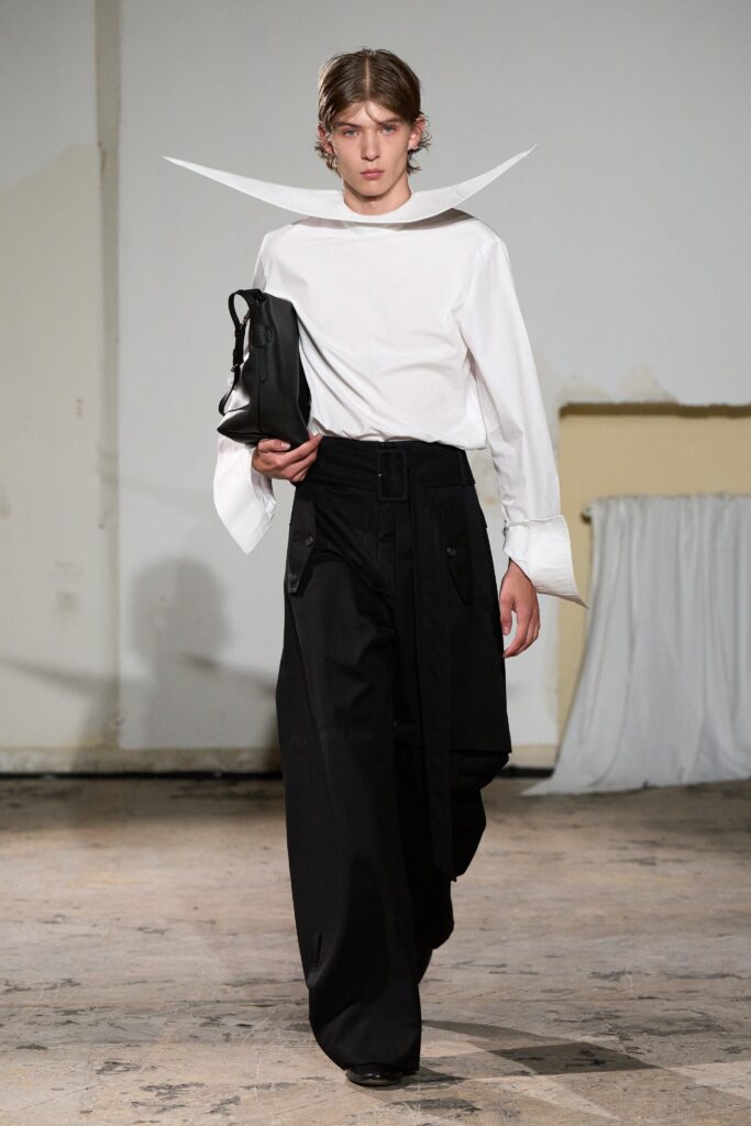 Présenté en hommage au grand-père de Florentin Glémarec, l’un des deux fondateurs du label, le défilé Egonlab printemps-été 2026 « In Memoriam » puise dans les racines bretonnes du designer pour tisser un récit intime, traversé par la poésie et la mémoire. Entre ciel et terre, porté par des silhouettes aériennes et un sens de la douceur, le show mettait en scène des cols pointus en suspension, des broderies traditionnelles, tandis que les binious, portés à l’épaule devenaient de nouveaux it-bags. Mention spéciale à la chemise finale, co-créée avec le sculpteur Flávio Juán Núñez, symbole d’un amour éternel.