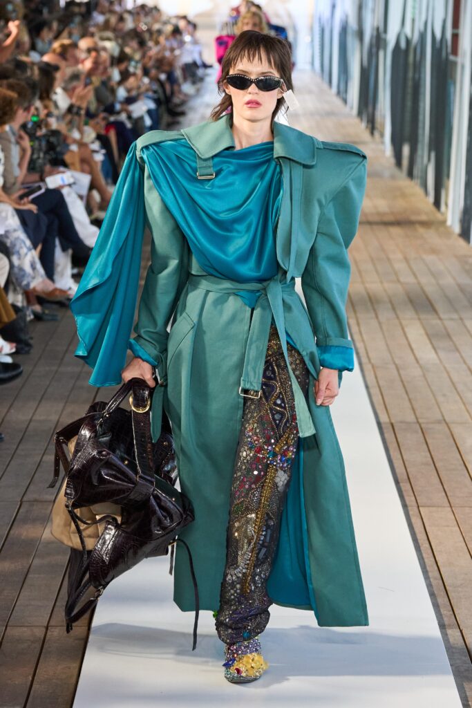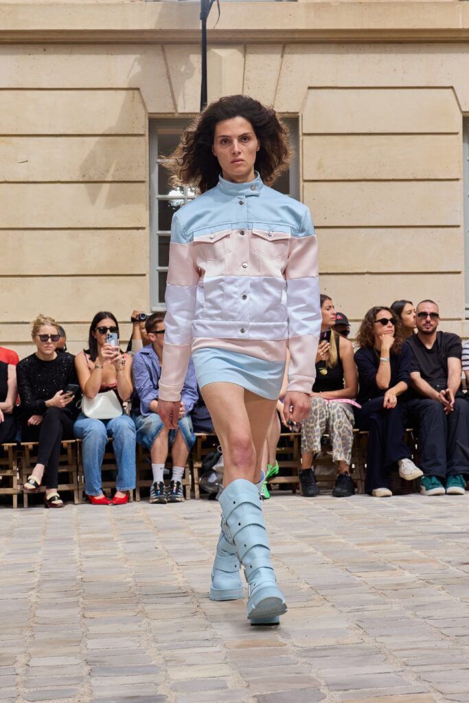 Avec sa collection « Resistance », Jeanne Friot transforme le défilé en acte politique. En plaçant des personnes trans au cœur de son casting, la créatrice fait de la mode une scène de visibilité, de lutte et de fierté. Militante dans l’âme, elle célèbre les identités queer et marginalisées, refusant le silence ou l’effacement à l’heure où la communauté transgenre fait face à toujours plus de menaces. Véritable manifeste, la collection dénonçait également les guerres, toujours plus nombreuses, en cours.