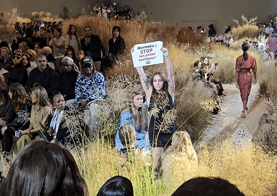 Une militante fait irruption sur le podium lors du défilé Hermès.